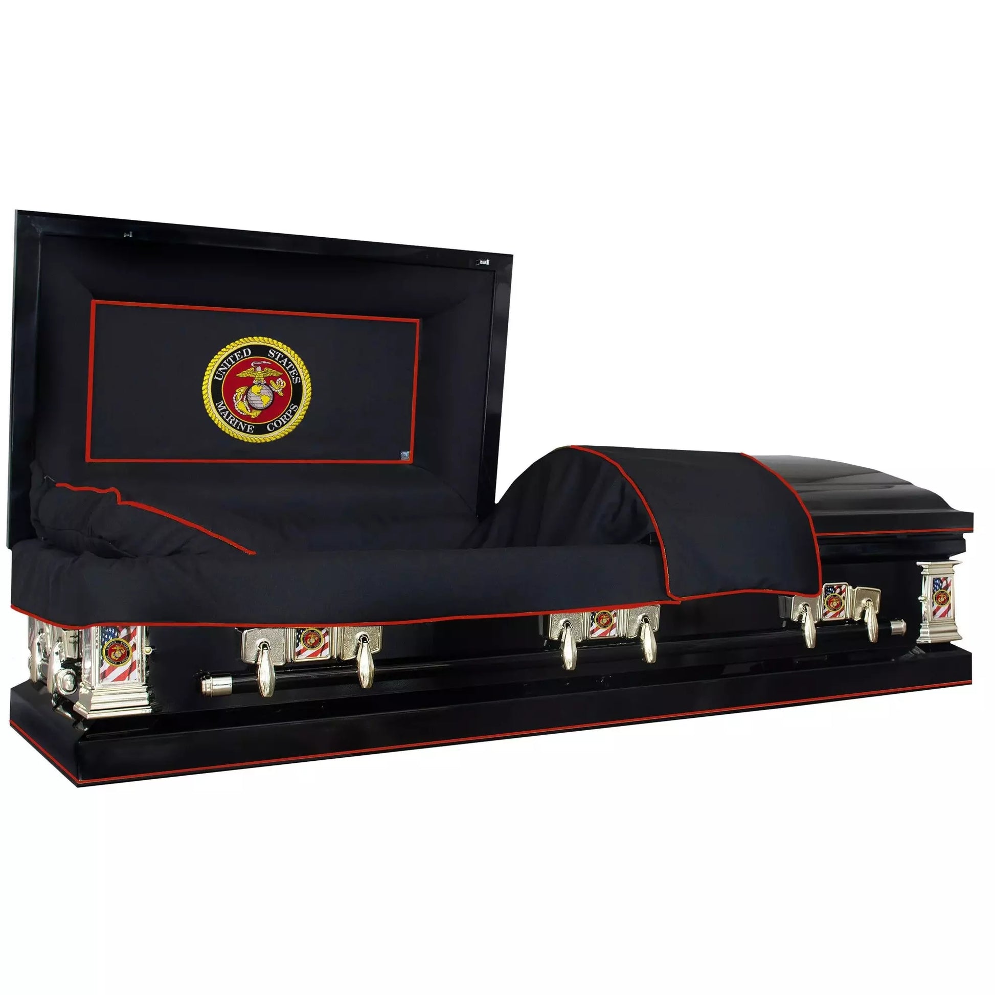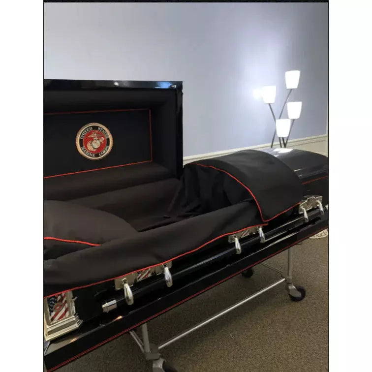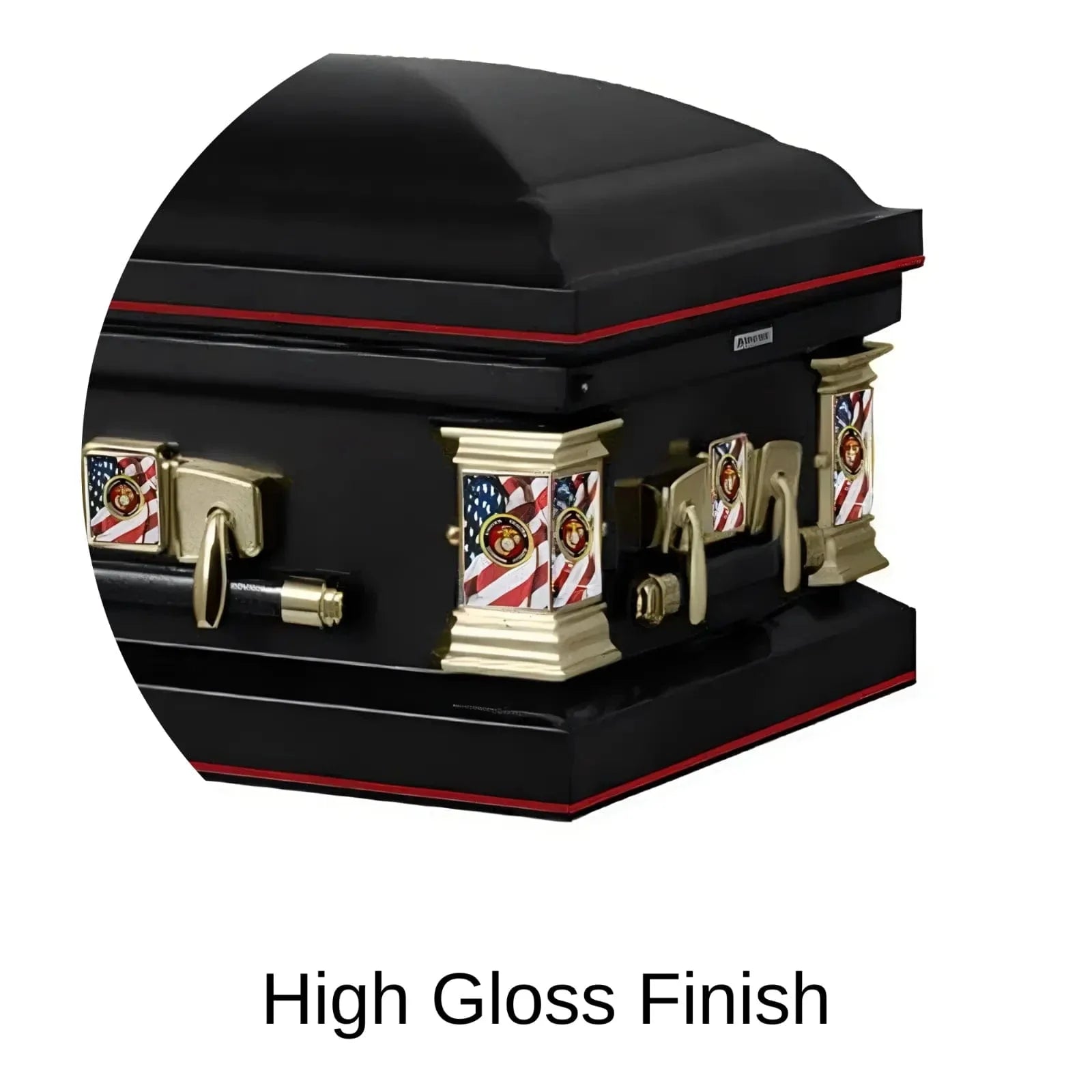 The Regal Patriot Classic Marines steel casket is handcrafted with a high gloss finish and adorned with tasteful national accents such as an embroidered branch of service head panel and matching metal hardware. This dignified Marines casket is fit to honor a loved one's career of duty and service to our great country.