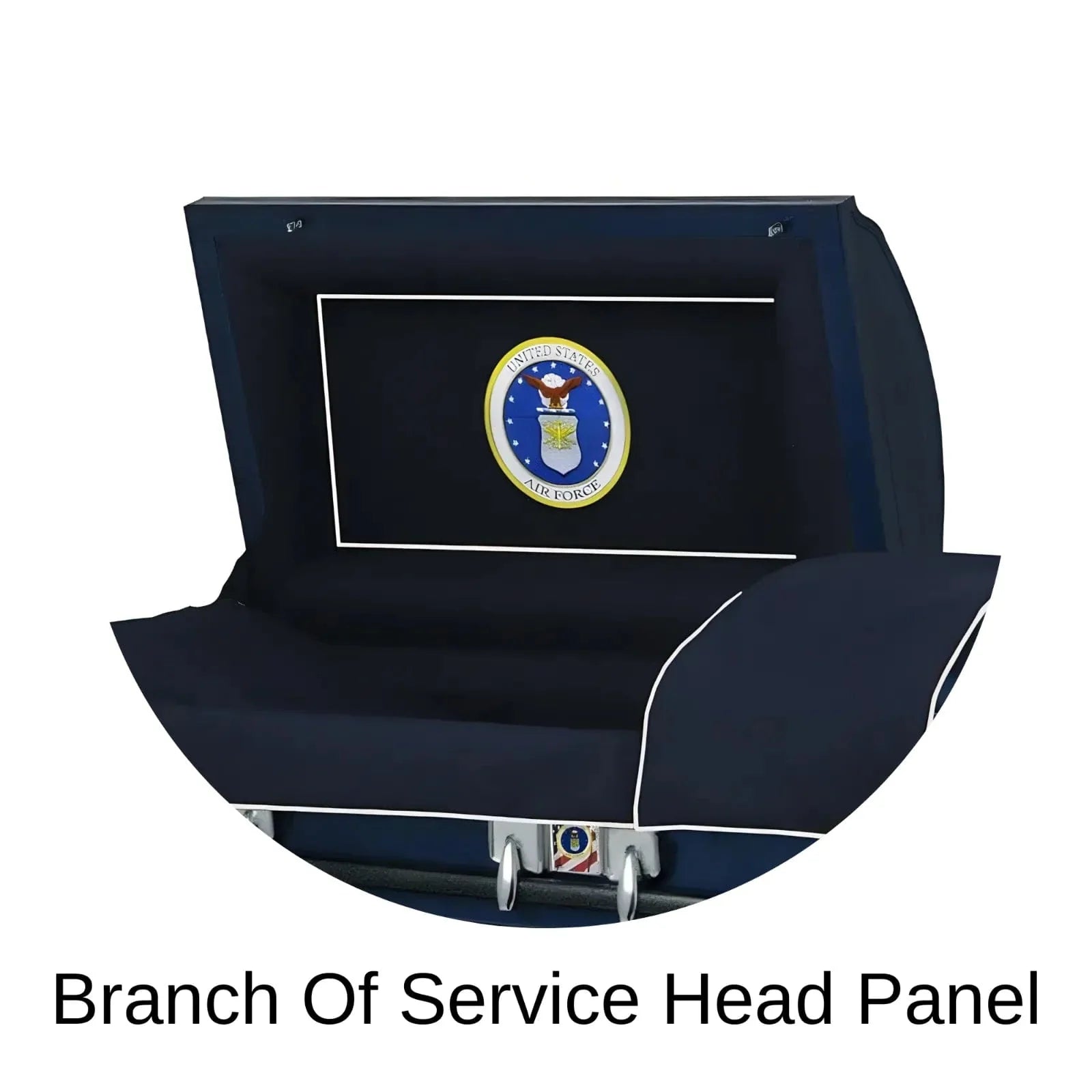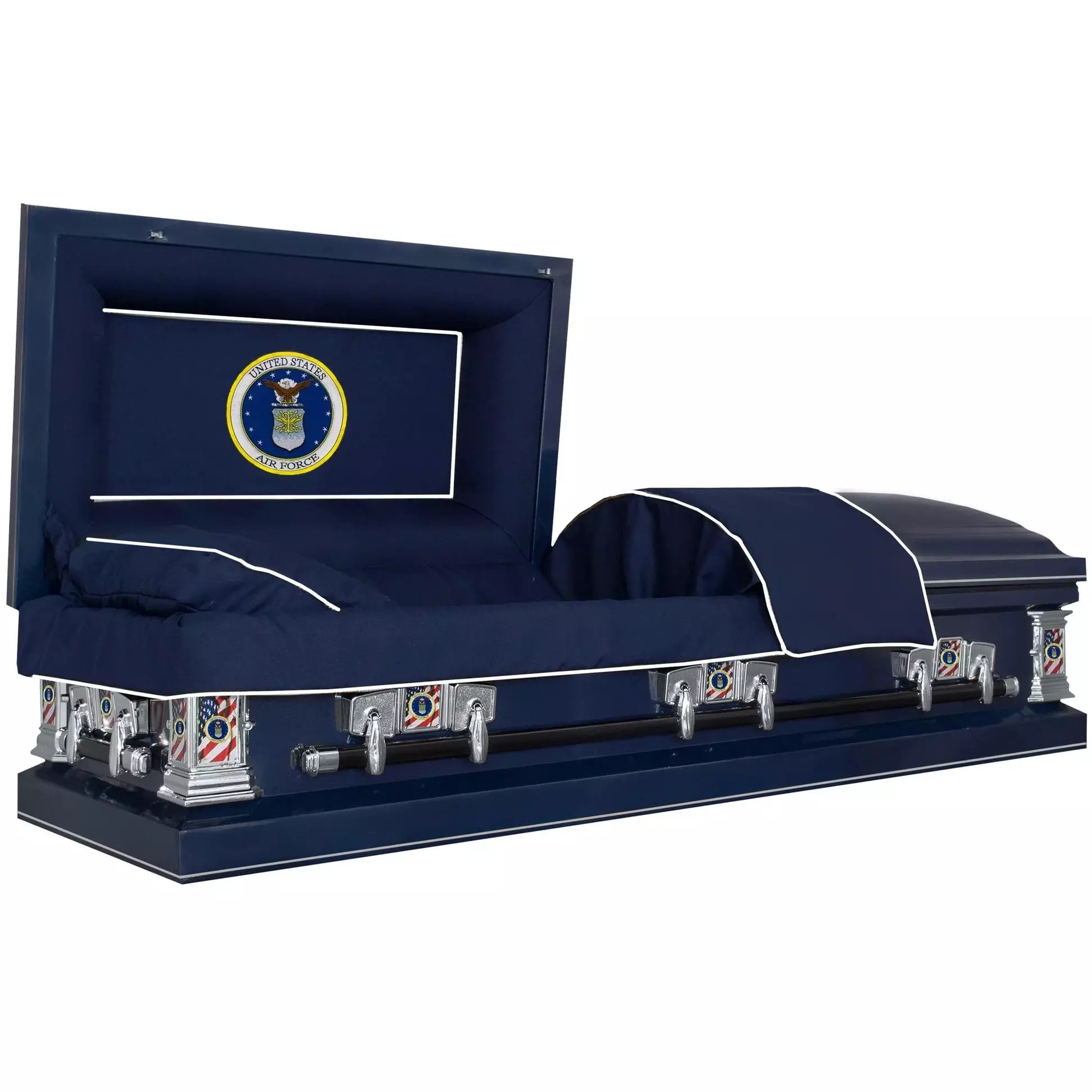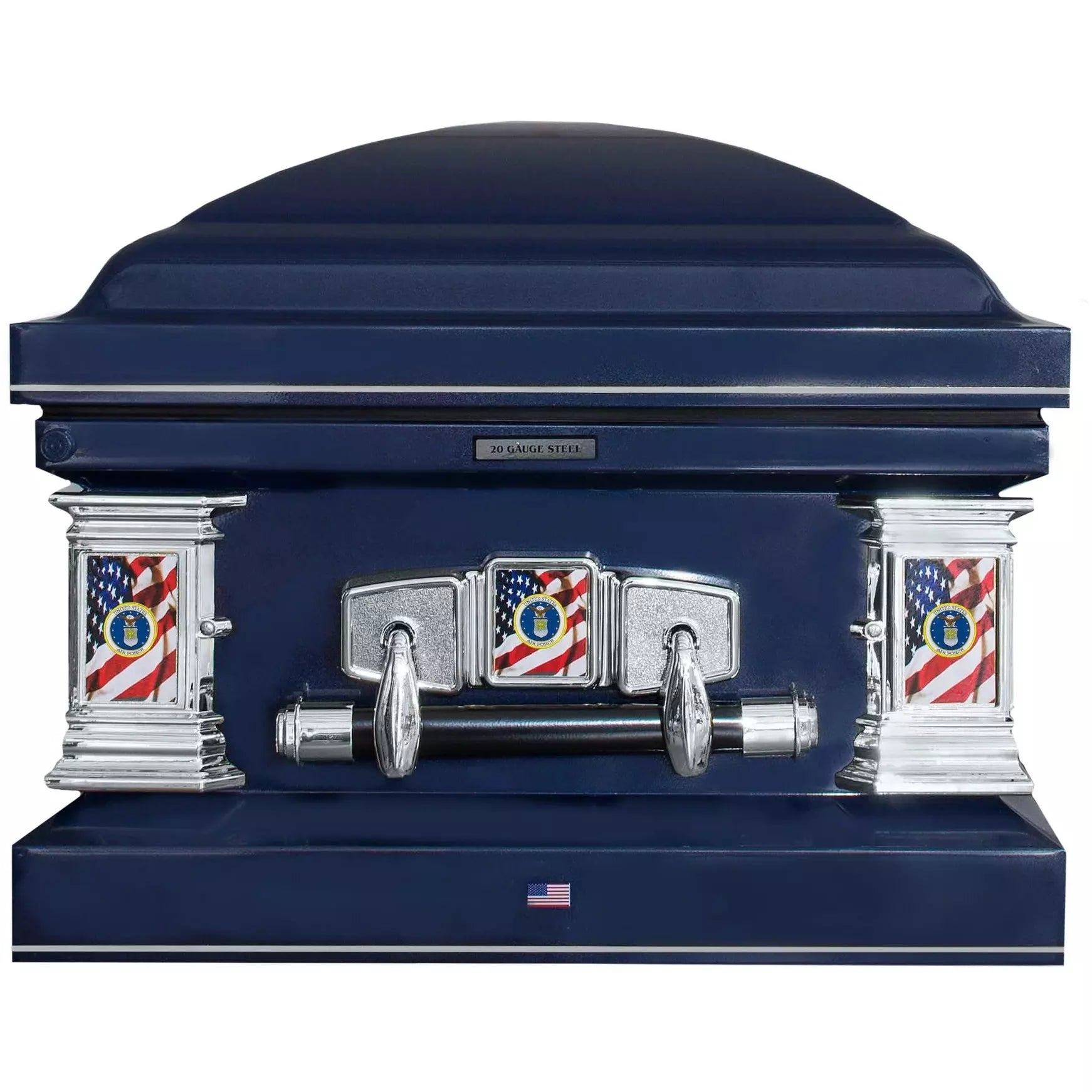 The Regal Patriot Classic Air Force steel casket is handcrafted with a high gloss finish and adorned with tasteful national accents such as an embroidered branch of service head panel and matching metal hardware. This dignified Air Force casket is fit to honor a loved one's career of duty and service to our great country.