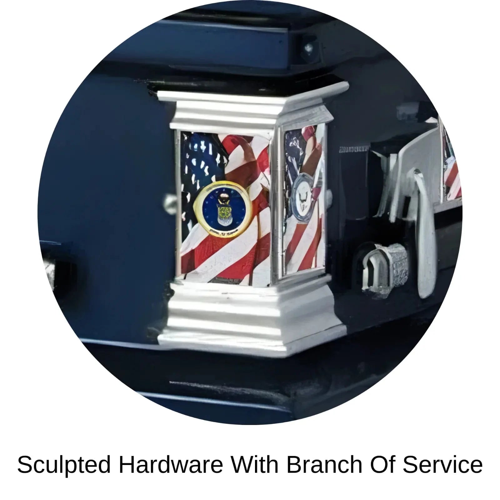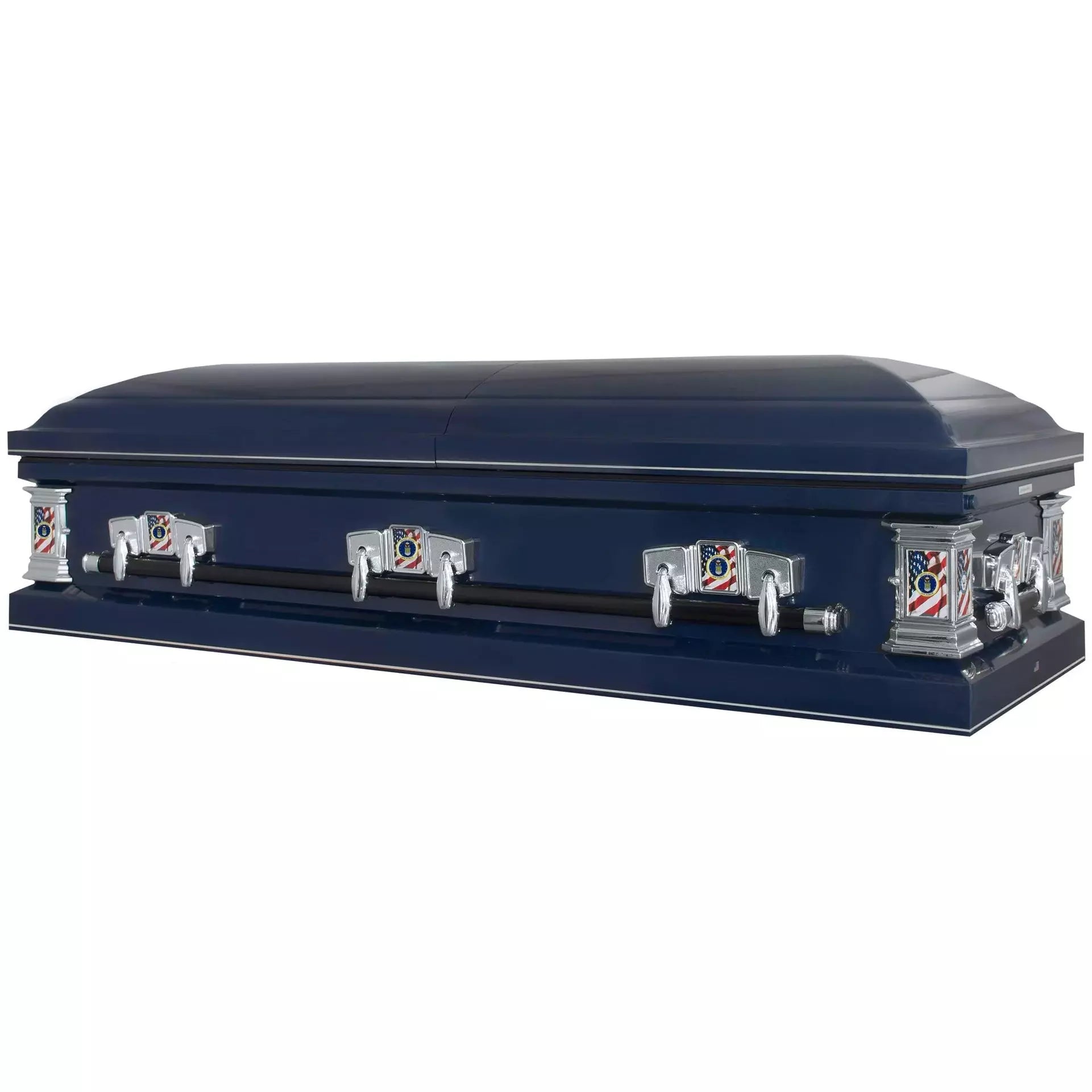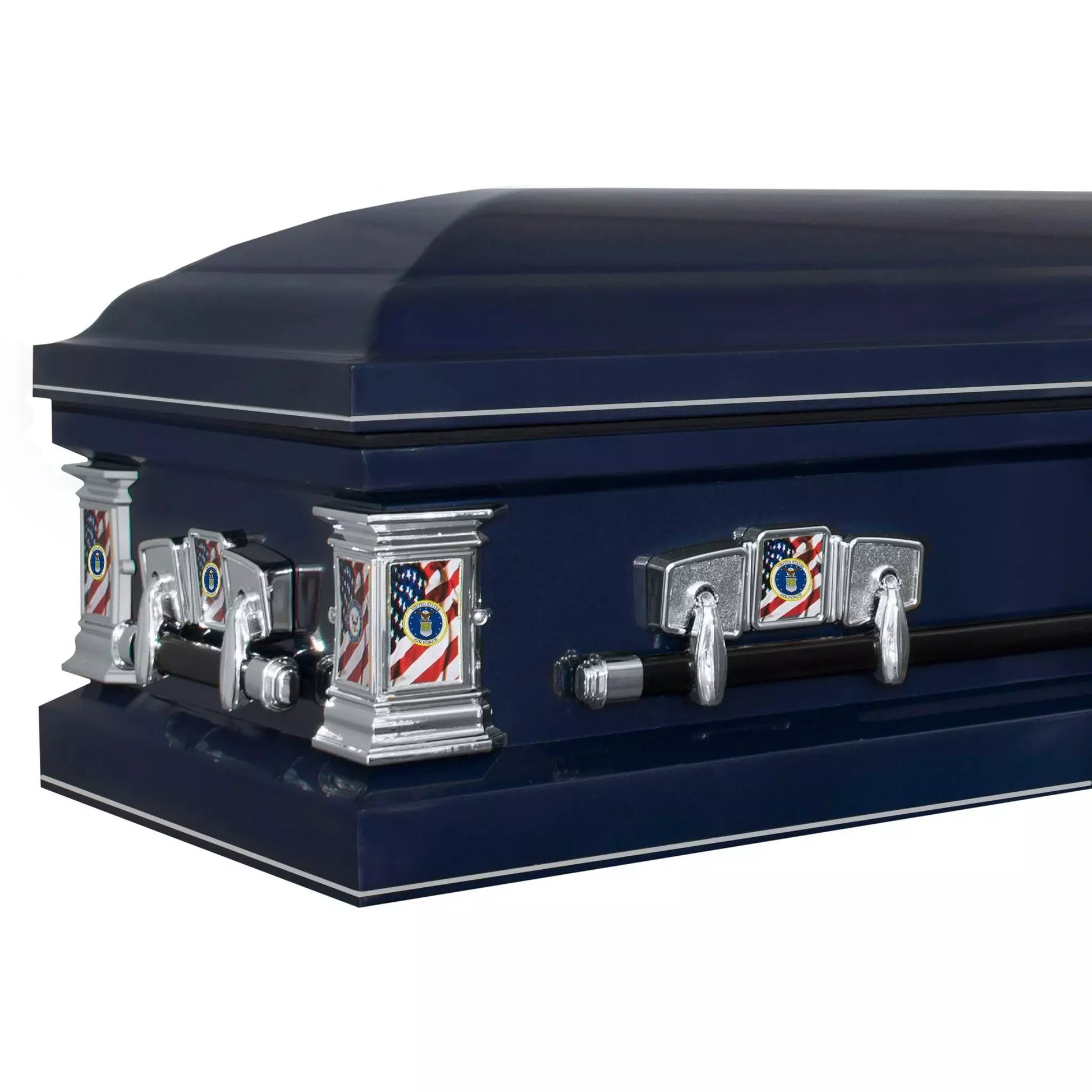 The Regal Patriot Classic Air Force steel casket is handcrafted with a high gloss finish and adorned with tasteful national accents such as an embroidered branch of service head panel and matching metal hardware. This dignified Air Force casket is fit to honor a loved one's career of duty and service to our great country.