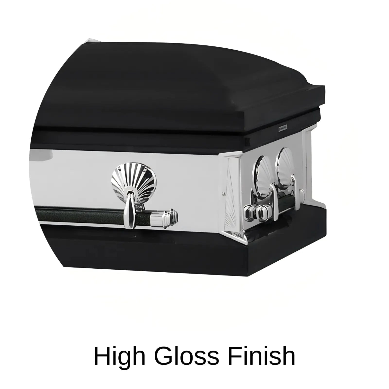 The Regal Emerald Series steel casket is alluring and stunning due to its 360 degree reflective panel. Seashell hardware accents this memorable casket and high-gloss paint compliments the polished finish. A locking mechanism and rubber gasket is included.