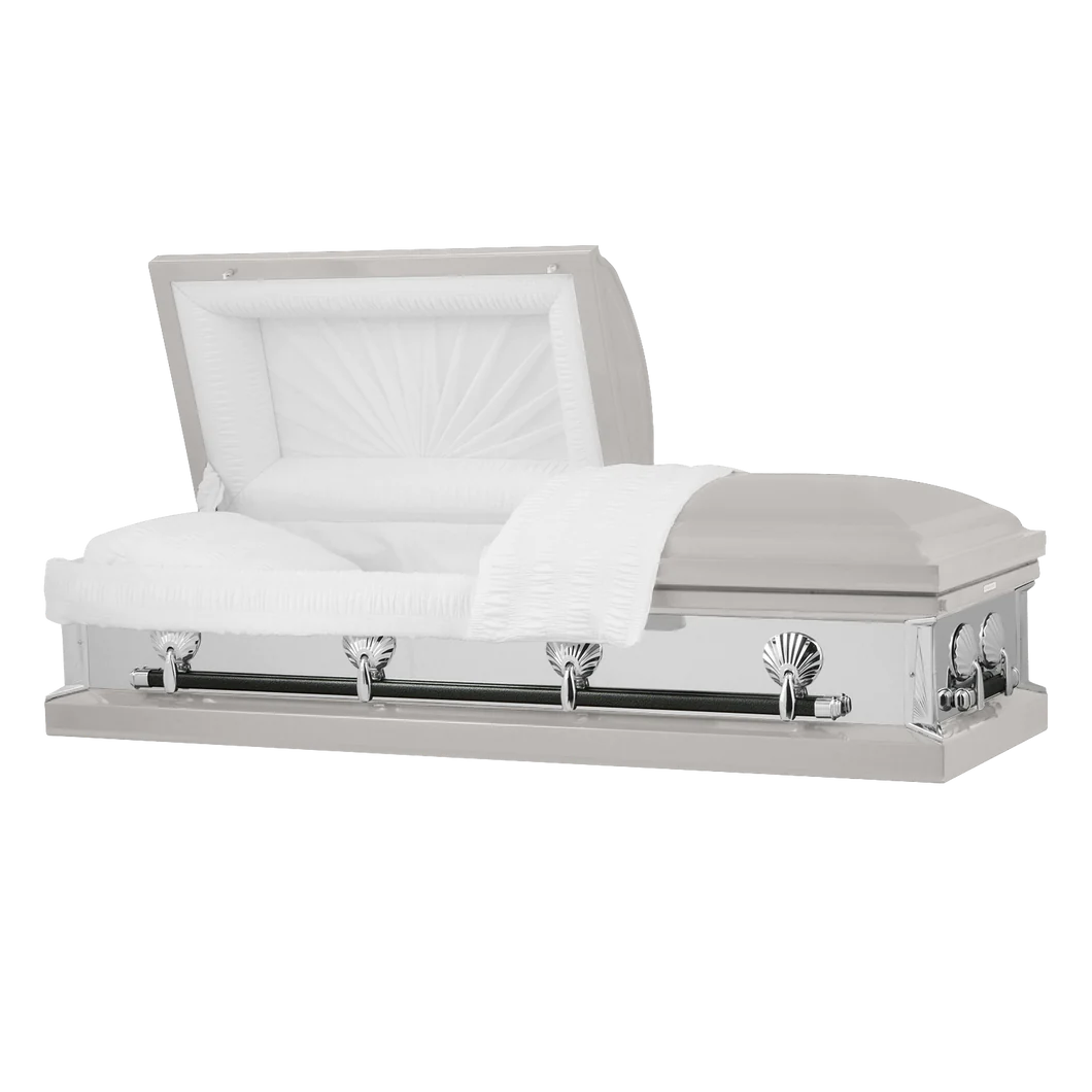 The Regal Emerald Series steel casket is alluring and stunning due to its 360 degree reflective panel. Seashell hardware accents this memorable casket and high-gloss paint compliments the polished finish. A locking mechanism and rubber gasket is included.
