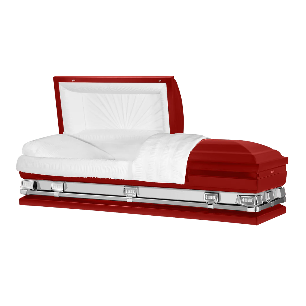The Regal Emerald XL steel casket is handcrafted and oversize with a high gloss finish, intricate hardware, reinforced handles, and a soft crepe fabric interior. It is available a variety of colors and sizes ranging from 28" to 36" wide. Finished with a 360 degree reflective panel, it comes equipped with a rubber gasket and locking mechanism.