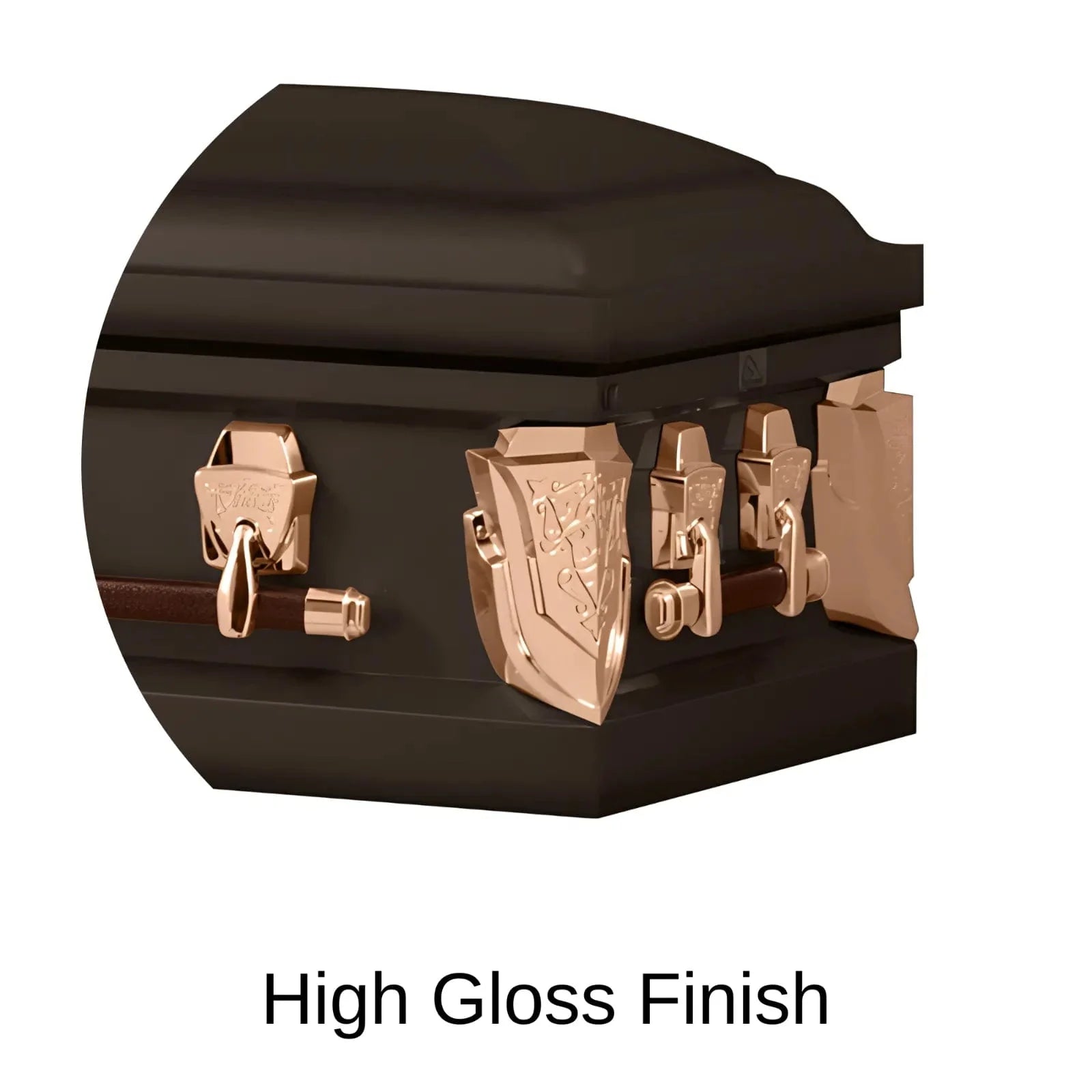 The Regal Imperial Series has the accoutrements of a luxury casket, at a fraction of the price. Built from upgraded 18-gauge steel, the interior is lined with velvet and has a tufted head panel. The exterior is completed by intricate metal hardware and swingbar handles. This distinguished casket is available in over 20 color schemes and comes standard with a rubber gasket and locking mechanism.