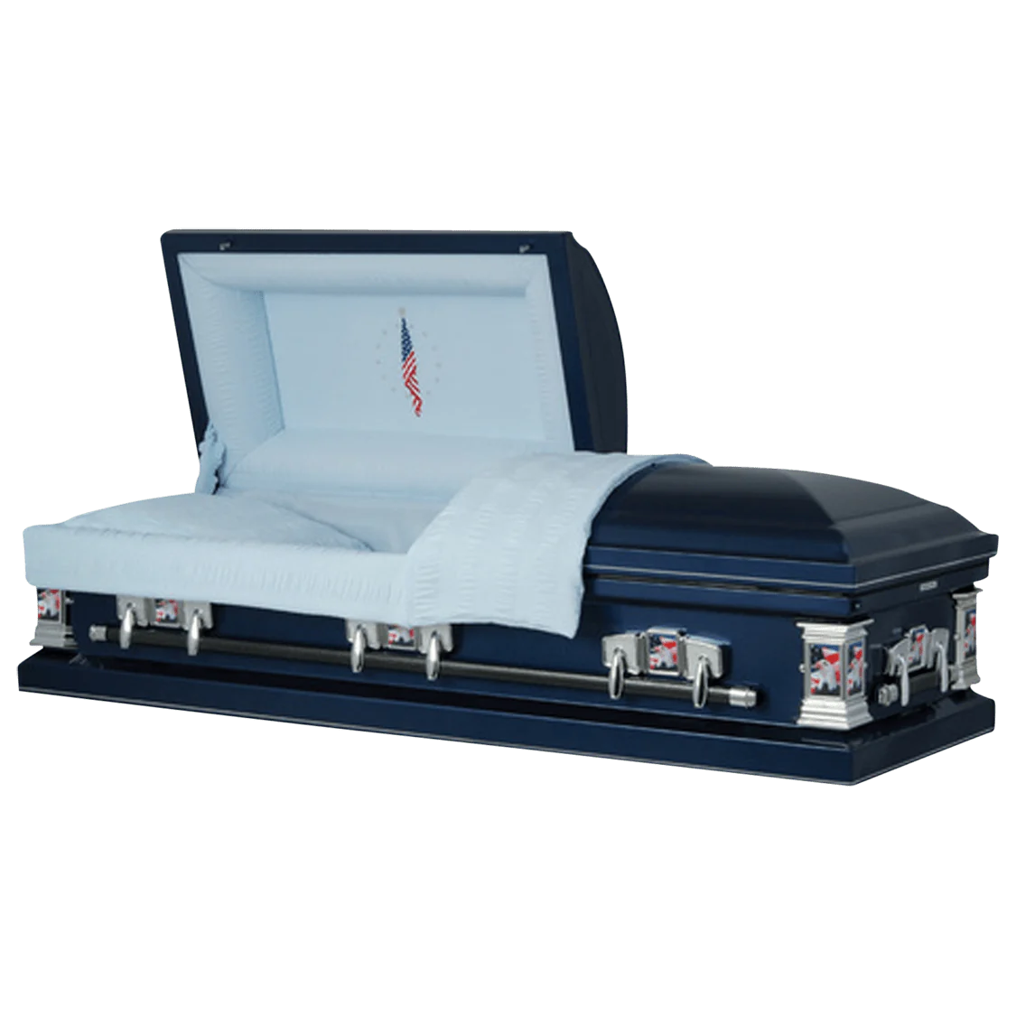 The Regal Patriot steel casket is handcrafted with a high gloss finish and adorned with tasteful national accents such as an embroidered Flag at Rest head panel and American imagery on the metal hardware. This dignified casket is fit to honor a loved one's career of duty and service to our great country.