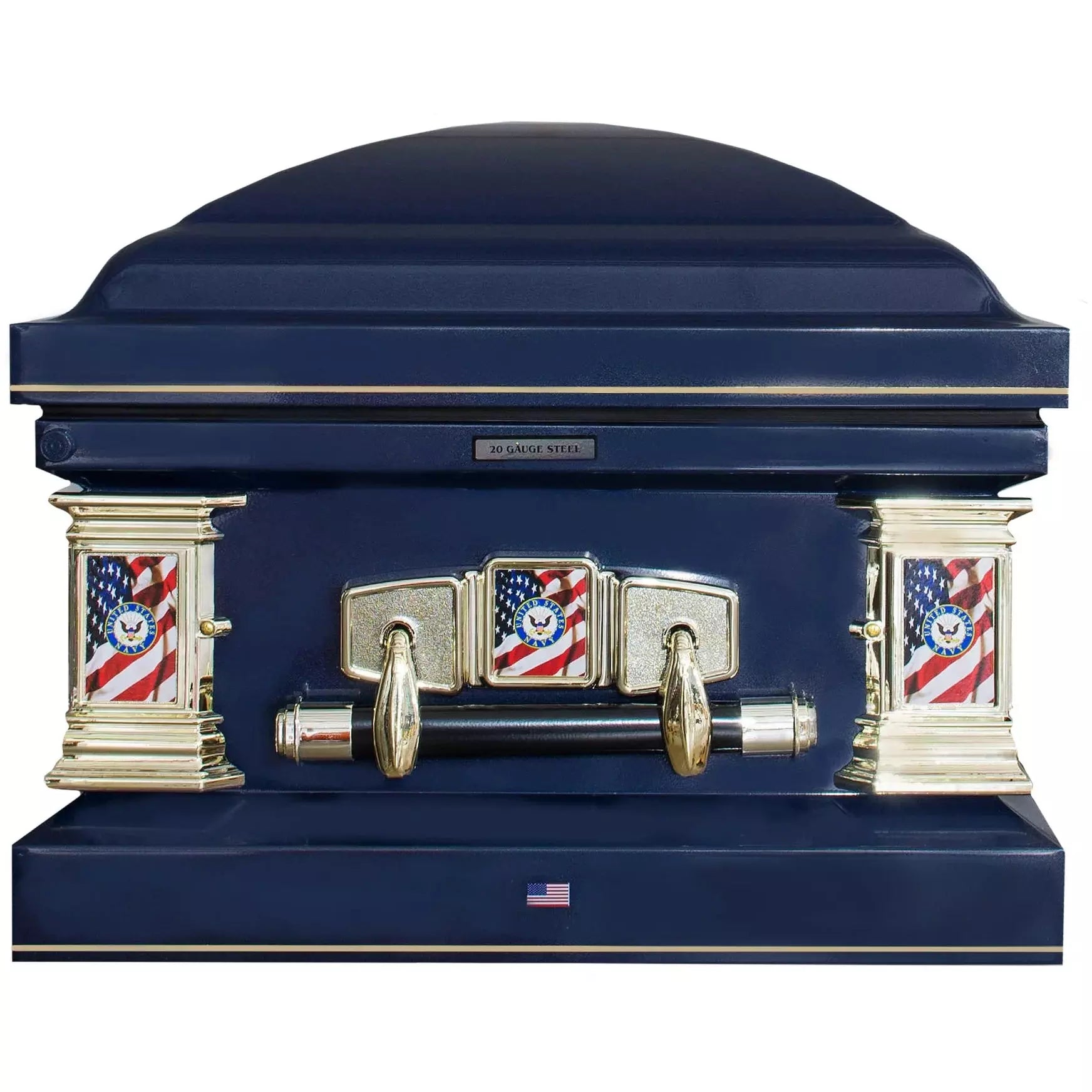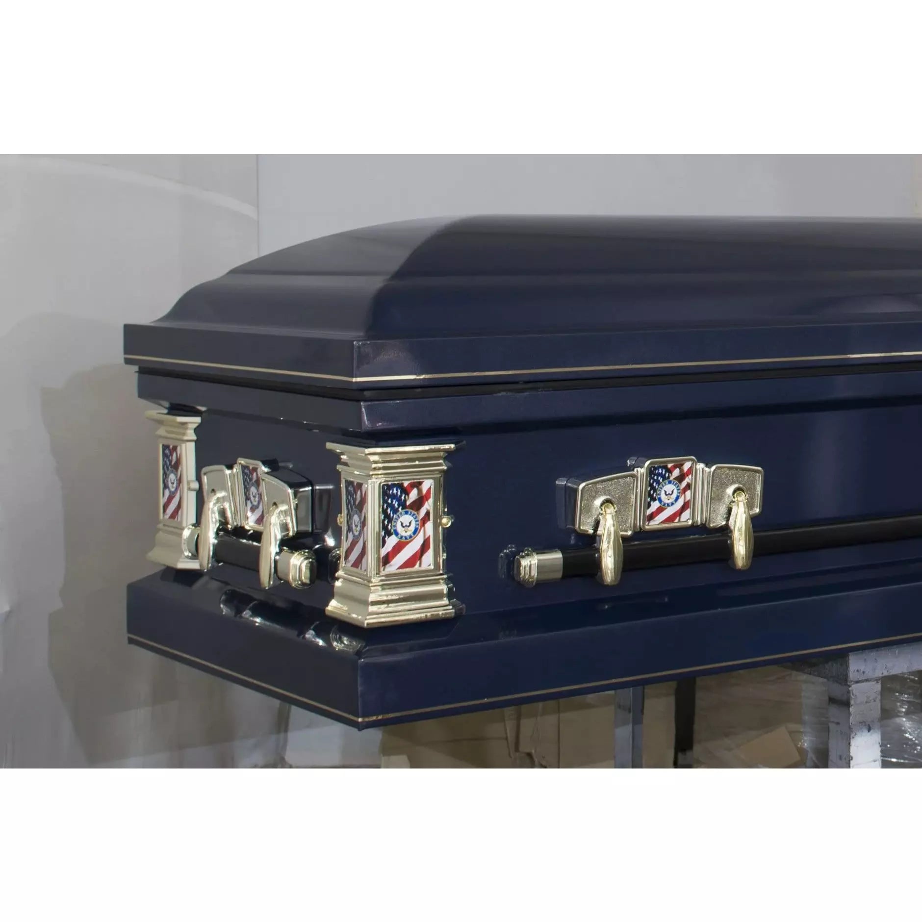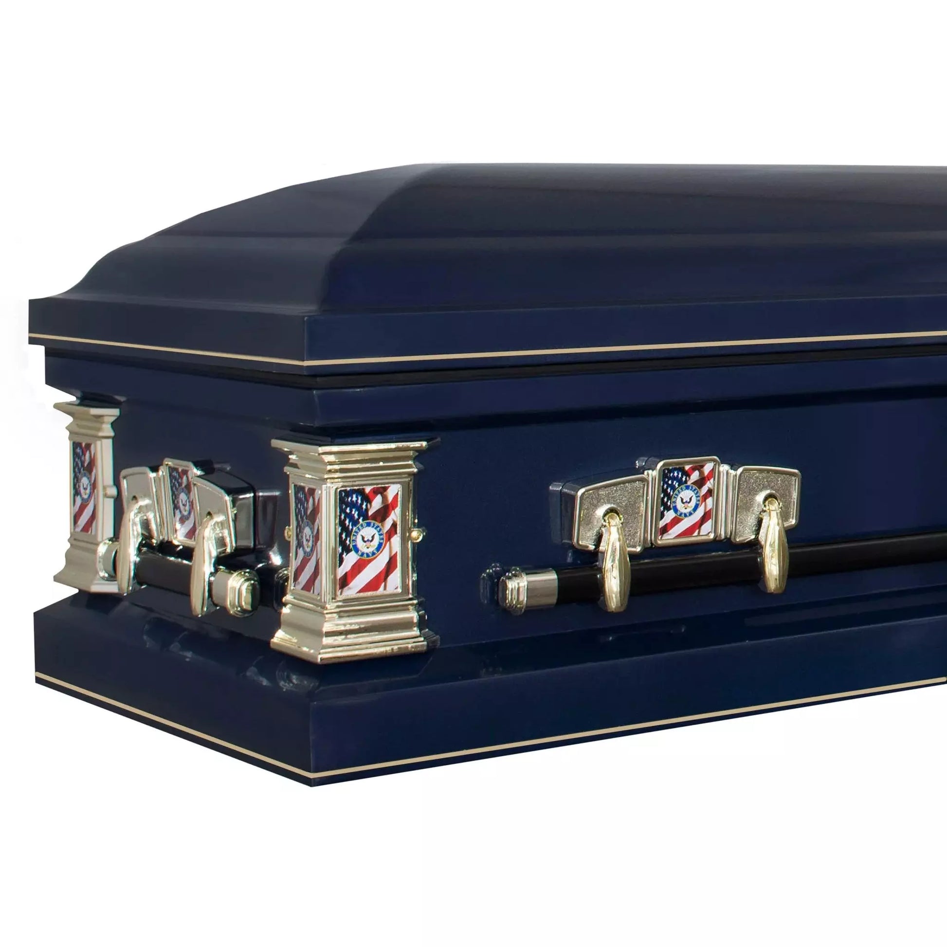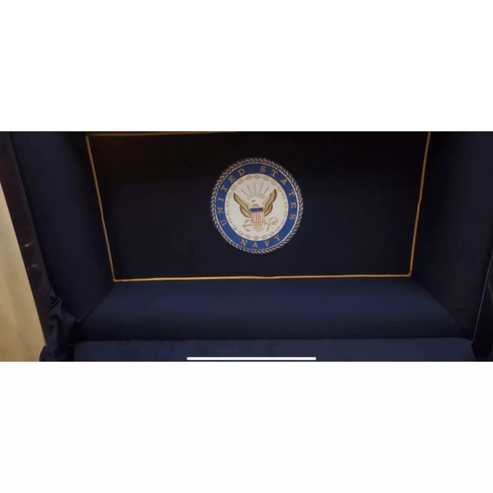 The Regal Patriot Classic Navy steel casket is handcrafted with a high gloss finish and adorned with tasteful national accents such as an embroidered branch of service head panel and matching metal hardware. This dignified Navy casket is fit to honor a loved one's career of duty and service to our great country.