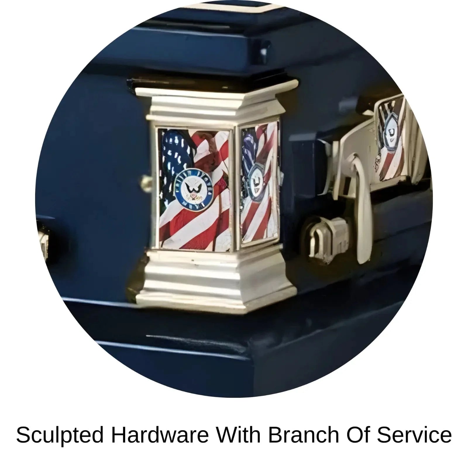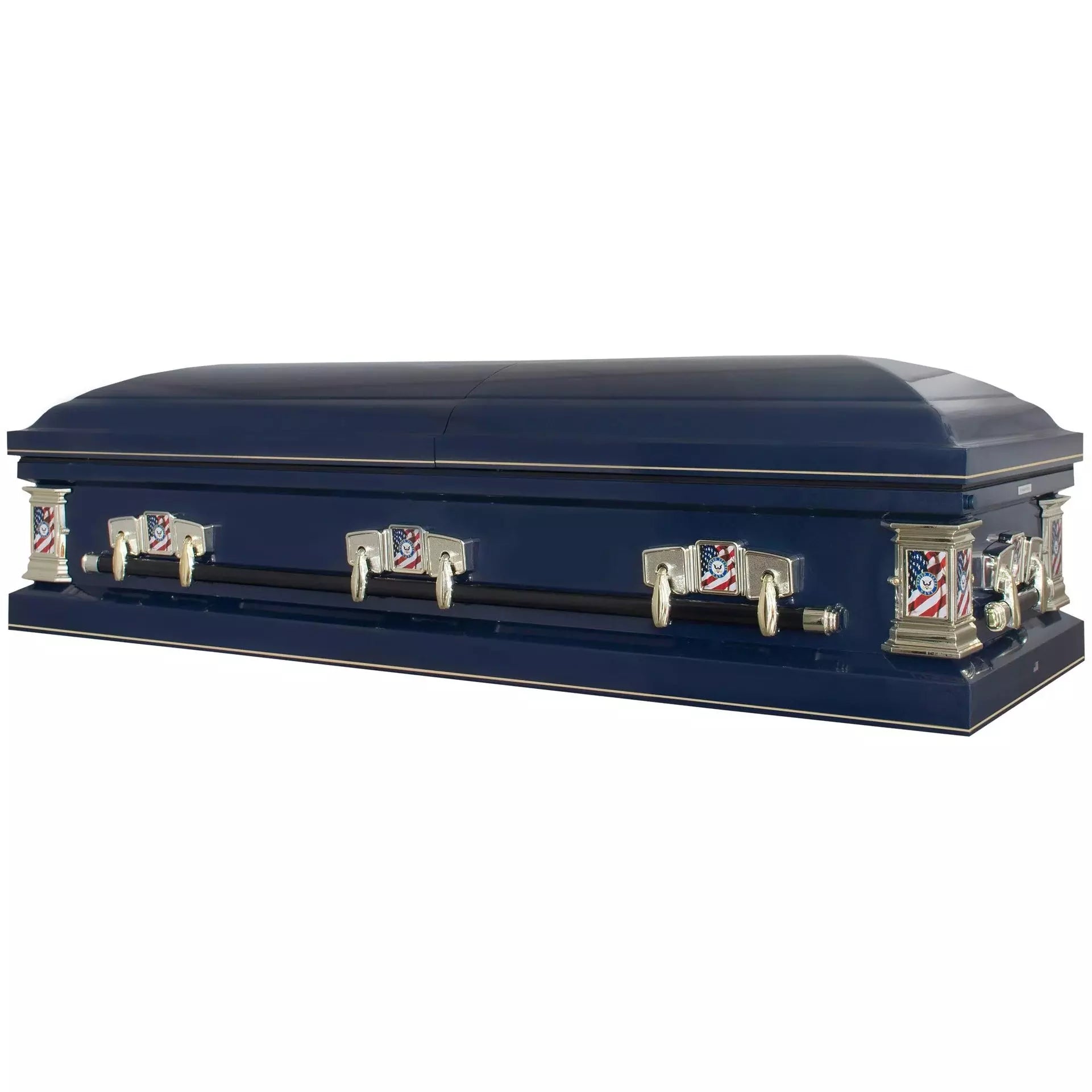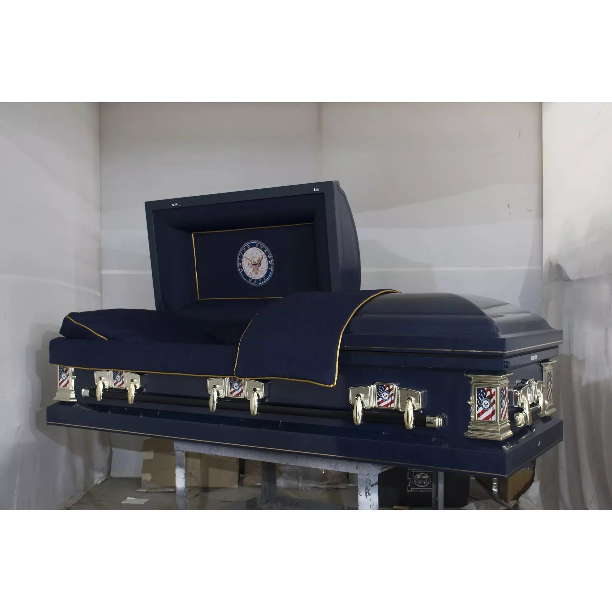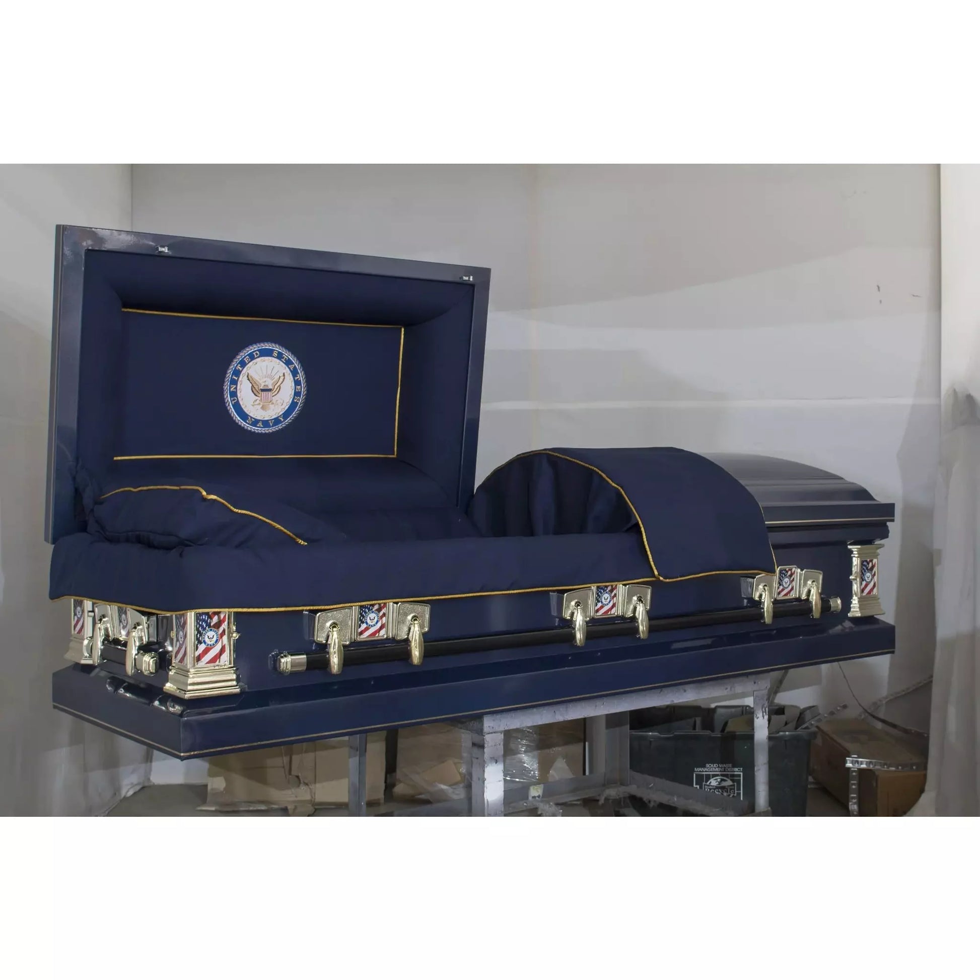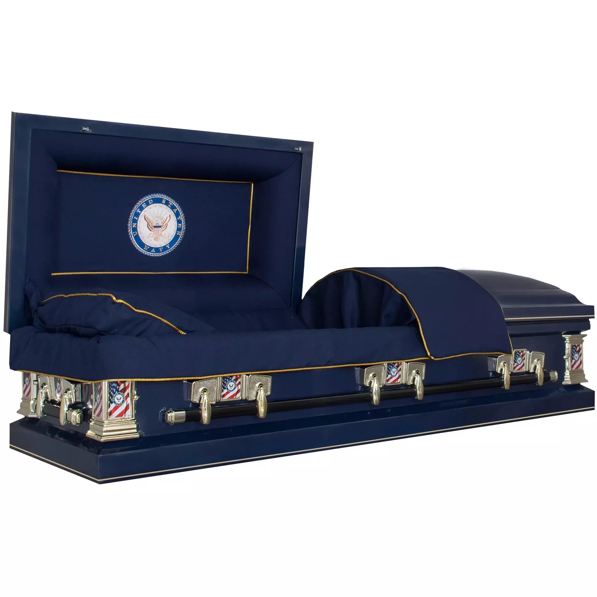 The Regal Patriot Classic Navy steel casket is handcrafted with a high gloss finish and adorned with tasteful national accents such as an embroidered branch of service head panel and matching metal hardware. This dignified Navy casket is fit to honor a loved one's career of duty and service to our great country.